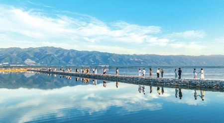 6月9日,運城市七彩鹽湖景區(qū)游人如織,藍天、白云、遠山、鹽湖構(gòu)成一幅美麗畫卷,游客們宛如穿梭在“天空之鏡”。金玉敏攝