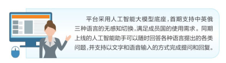 該平臺采用人工智能大模型底座,首期支持中英俄三種語言的無感知切換,滿足成員國的使用需求。同期上線的人工智能助手可以隨時回答各種語言提出的各類問題,并支持以文字和語音輸入的方式完成提問和回復。二期平臺更新后,將實現產業(yè)標簽、企業(yè)和產品的自動推薦功能,人工智能在用戶注冊后,可為用戶自動生成和匹配目標企業(yè)與目標產品,優(yōu)化用戶體驗。