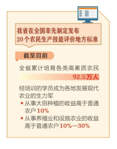 2014年開展農(nóng)民教育培訓(xùn)工作以來,我省各級農(nóng)業(yè)農(nóng)村部門圍繞全面支撐糧食安全和重要農(nóng)產(chǎn)品穩(wěn)定供給,統(tǒng)籌推進(jìn)農(nóng)業(yè)經(jīng)理人、農(nóng)村創(chuàng)新創(chuàng)業(yè)者、鄉(xiāng)村治理及農(nóng)村社會事業(yè)發(fā)展帶頭人和種養(yǎng)加能手等六大類開展培訓(xùn),為推進(jìn)鄉(xiāng)村全面振興提供了有力人才保障。我省還在全國率先制定發(fā)布20個農(nóng)民生產(chǎn)技能評價地方標(biāo)準(zhǔn),建立了涵蓋主要農(nóng)作物種植品種和畜禽養(yǎng)殖品種的技能評價標(biāo)準(zhǔn)體系。截至目前,全省累計(jì)培育各類高素質(zhì)農(nóng)民92.5萬人,高素質(zhì)農(nóng)民培育績效考核持續(xù)排在全國優(yōu)秀行列。經(jīng)培訓(xùn)的學(xué)員活躍在農(nóng)業(yè)生產(chǎn)經(jīng)營各領(lǐng)域,成為各地發(fā)展現(xiàn)代農(nóng)業(yè)的生力軍,從事大田種植的收益高于普通農(nóng)戶10%,從事養(yǎng)殖業(yè)和設(shè)施農(nóng)業(yè)的收益高于普通農(nóng)戶10%—30%。