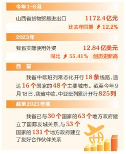牢記殷殷囑托,奏響開(kāi)放強(qiáng)音。當(dāng)前,全省上下牢記習(xí)近平總書記殷殷囑托,堅(jiān)定不移推進(jìn)更高水平對(duì)外開(kāi)放,著力優(yōu)化開(kāi)放布局、推進(jìn)制度型開(kāi)放、促進(jìn)對(duì)外貿(mào)易擴(kuò)量提質(zhì)、提升開(kāi)放平臺(tái)能級(jí)、建設(shè)開(kāi)放通道、提升投資貿(mào)易便利化、加強(qiáng)開(kāi)放創(chuàng)新能力合作,加快構(gòu)建起多元發(fā)展、多點(diǎn)支撐的全面開(kāi)放新格局,作為內(nèi)陸省份,山西對(duì)外開(kāi)放的力度越來(lái)越大。