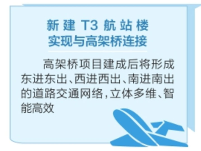 高架橋項目建成后將連接現(xiàn)有機場航站樓和新建T3航站樓、綜合交通中心及機場東路等,形成東進東出、西進西出、南進南出的道路交通網(wǎng)絡(luò),達到立體多維、智能高效的交通疏導(dǎo)目標(biāo),實現(xiàn)便捷、快速進出機場的功能。