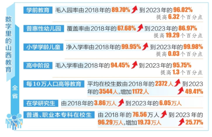 全省普惠性幼兒園覆蓋率從2020年的84.83%提高至2023年的86.97%,其中大同市達到96.63%,位列全省第一;學前教育毛入園率從2020年的90.8%提高至2023年的96.02%,高出全國平均水平4.92個百分點。小學、初中學齡兒童凈入學率分別保持在99.95%、99.66%以上,高中階段毛入學率2023年提升至95.75%,并率先實現(xiàn)20萬人口以上的縣特殊教育學校全覆蓋,控輟保學從動態(tài)清零轉(zhuǎn)向常態(tài)清零,“有學上”問題得到全面解決。
