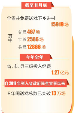 2017年該活動列入省政府民生實事以來,8年間送戲總數(shù)已突破13萬場,讓人民群眾真切感受到了黨和政府的關(guān)懷和溫暖。