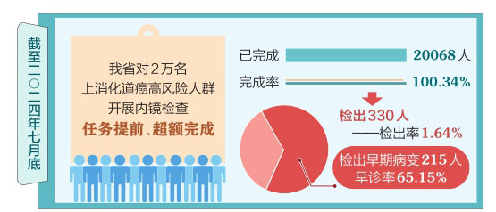 截至2024年7月底,對2萬名上消化道癌高風險人群開展內(nèi)鏡檢查任務(wù)提前、超額完成。全省2萬名篩查任務(wù),已完成20068人,完成率100.34%;檢出330人,檢出率1.64%;檢出早期病變215人,早診率65.15%。
