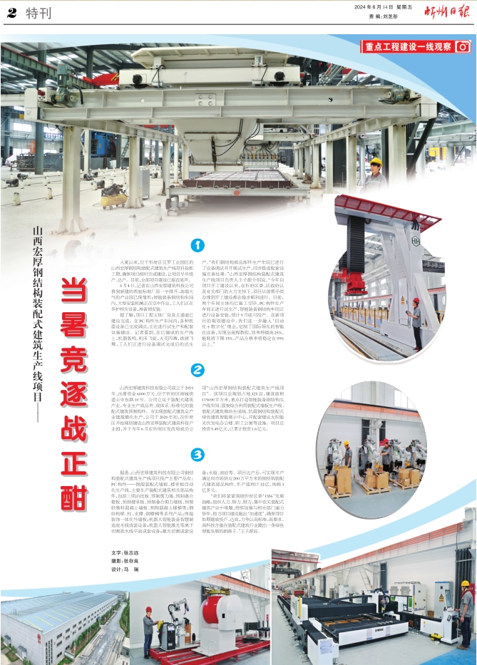 6月4日,記者在山西宏厚建筑科技公司看到新建的兩座標準廠房一字排開,高端大氣的產(chǎn)業(yè)園已現(xiàn)雛形;智能裝備鋼結構車間內(nèi),大型安裝機械正在空中作業(yè),工人們正在養(yǎng)護相關設備,準備預安裝。