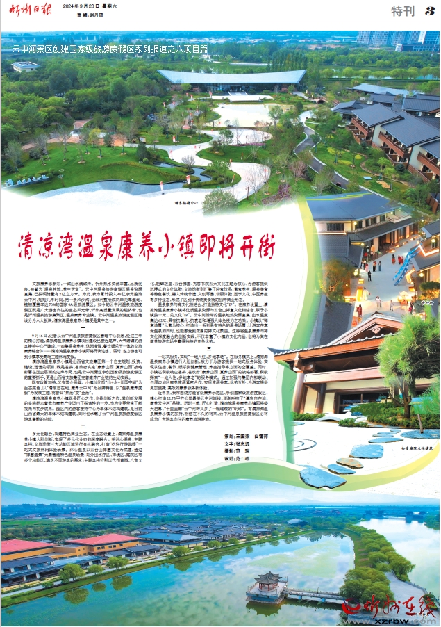 文旅康養(yǎng)添新彩,一城山水滿城詩。忻州熱水資源豐富、品質優(yōu)良,被譽為“溫泉勝地、養(yǎng)生天堂”。云中河溫泉旅游度假區(qū)溫泉資源富集,已探明儲量有2億立方米。為此,我市累計投入48億余元整治云中河,短短幾年時間,把一條風沙溝、垃圾河整治成兩岸花草遍地、植被覆蓋率達70%的國家4A級旅游景區(qū)。如今的云中河溫泉旅游度假區(qū)既是廣大游客向往的生態(tài)風光帶、忻州高質量發(fā)展的經濟帶,也是忻州溫泉旅游集聚區(qū)、溫泉康養(yǎng)專業(yè)鎮(zhèn)。云中河溫泉旅游度假區(qū)建設分為六大板塊,清涼灣溫泉康養(yǎng)小鎮(zhèn)便是其中之一。
