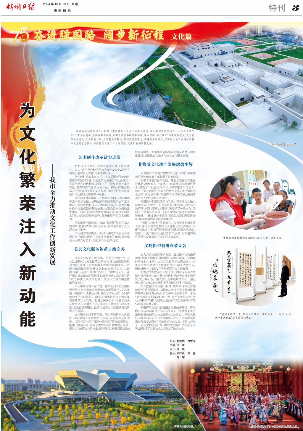 深入挖掘文物價(jià)值,講好忻州故事。《館長帶您讀忻州》系列短視頻,入圍2023年度中華文物新媒體傳播精品推介精品項(xiàng)目和優(yōu)秀項(xiàng)目推薦名單。承辦“第五屆中國長城論壇暨山西·忻州文化旅游季”活動(dòng),并持續(xù)開展“長城兩邊是故鄉(xiāng)”文化旅游季,有效弘揚(yáng)忻州長城文化。
