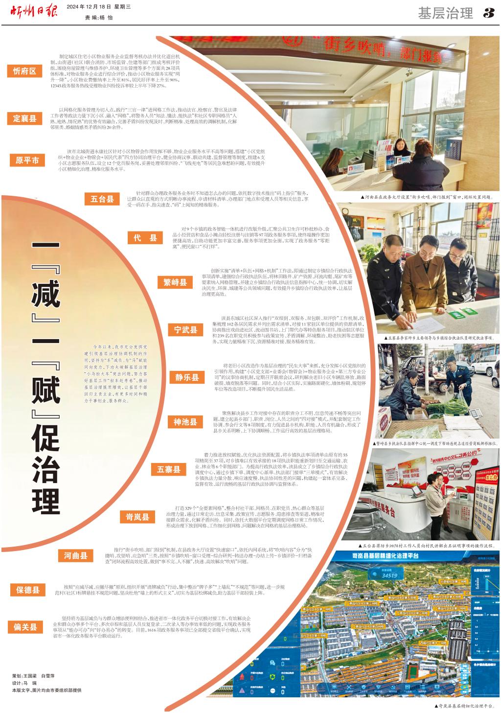 今年以來(lái),我市充分發(fā)揮黨建引領(lǐng)基層治理協(xié)調(diào)機(jī)制的作用,堅(jiān)持為“車(chē)”減負(fù)、為“馬”賦能同向發(fā)力,下功夫破解基層治理“小馬拉大車(chē)”突出問(wèn)題,努力答好基層工作“拉車(chē)趕考卷”,推動(dòng)基層治理提質(zhì)增效,讓基層干部回歸主責(zé)主業(yè),有更多時(shí)間和精力干事創(chuàng)業(yè)、服務(wù)群眾。 忻府區(qū) 制定城區(qū)住宅小區(qū)物業(yè)服務(wù)企業(yè)監(jiān)督考核辦法并優(yōu)化退出機(jī)制,由街道(社區(qū))聯(lián)合消防、市場(chǎng)監(jiān)管、住建等部門(mén)組成考核評(píng)價(jià)組,圍繞房屋管理與維修養(yǎng)護(hù)、環(huán)境衛(wèi)生管理等多個(gè)方面共28項(xiàng)具體標(biāo)準(zhǔn),對(duì)物業(yè)服務(wù)企業(yè)進(jìn)行綜合評(píng)價(jià),推動(dòng)小區(qū)物業(yè)服務(wù)實(shí)現(xiàn)“兩升一降”,小區(qū)物業(yè)費(fèi)繳納率上升至81%,居民好評(píng)率上升至90%,12345政務(wù)服務(wù)熱線受理物業(yè)糾紛投訴率較上半年下降27%。 定襄縣 以網(wǎng)格化服務(wù)管理為切入點(diǎn),踐行“三官一律”進(jìn)網(wǎng)格工作法,推動(dòng)法官、檢察官、警官及法律工作者等政法力量下沉小區(qū)、融入“網(wǎng)格”,將警務(wù)人員“知法、懂法、能執(zhí)法”和社區(qū)專(zhuān)職網(wǎng)格員“人熟、地熟、情況熟”的優(yōu)勢(shì)有效融合,完善矛盾糾紛發(fā)現(xiàn)及時(shí)、判斷精準(zhǔn)、處理高效的調(diào)解機(jī)制,化解鄰里類(lèi)、婚姻情感類(lèi)矛盾糾紛20余件。 原平市 該市北城街道永康社區(qū)針對(duì)小區(qū)物管會(huì)作用發(fā)揮不夠、物業(yè)企業(yè)服務(wù)水平不高等問(wèn)題,搭建“小區(qū)黨組織+物業(yè)企業(yè)+物管會(huì)+居民代表”四方協(xié)同治理平臺(tái),健全協(xié)商議事、聯(lián)動(dòng)共建、監(jiān)督管理等制度,組建6支小區(qū)志愿服務(wù)隊(duì)伍,設(shè)立12個(gè)黨員服務(wù)崗,妥善處理鄰里糾紛、“飛線充電”等居民急難愁盼問(wèn)題,有效提升小區(qū)精細(xì)化治理、精準(zhǔn)化服務(wù)水平。 五臺(tái)縣 針對(duì)群眾辦理政務(wù)服務(wù)業(yè)務(wù)時(shí)不知道怎么辦的問(wèn)題,依托數(shù)字技術(shù)推出“碼上指引”服務(wù),讓群眾以直觀的方式明晰辦事流程、申請(qǐng)材料清單、辦理部門(mén)地點(diǎn)和受理人員等相關(guān)信息,享受一碼在手、指尖速查、“碼”上閱知的精準(zhǔn)服務(wù)。 代 縣 對(duì)9個(gè)鄉(xiāng)鎮(zhèn)的政務(wù)智能一體機(jī)進(jìn)行改版升級(jí),匯聚公共衛(wèi)生許可秒批秒辦、食品小經(jīng)營(yíng)店和食品小攤點(diǎn)輕松注冊(cè)與注銷(xiāo)等97項(xiàng)政務(wù)服務(wù)事項(xiàng),使終端操作更加便捷高效,自助功能更加豐富完善,服務(wù)事項(xiàng)更加全面,實(shí)現(xiàn)了政務(wù)服務(wù)“零距離”、便民窗口“不打烊”。 繁峙縣 創(chuàng)新實(shí)施“清單+隊(duì)伍+網(wǎng)格+機(jī)制”工作法,即通過(guò)制定鄉(xiāng)鎮(zhèn)綜合行政執(zhí)法事項(xiàng)清單,建強(qiáng)綜合行政執(zhí)法隊(duì)伍,將林田路井、礦產(chǎn)資源、河流溝壑、尾礦庫(kù)等要素納入網(wǎng)格管理,并建立鄉(xiāng)鎮(zhèn)綜合行政執(zhí)法信息指揮中心,統(tǒng)一協(xié)調(diào),切實(shí)解決民生、環(huán)保、城建等公共領(lǐng)域問(wèn)題,有效提升鄉(xiāng)鎮(zhèn)綜合行政執(zhí)法效率,讓基層治理更高效。 寧武縣 該縣東城區(qū)社區(qū)深入推行“雙報(bào)到、雙服務(wù)、雙包聯(lián)、雙評(píng)價(jià)”工作機(jī)制,收集梳理102條居民需求并列出需求清單,對(duì)接11家駐區(qū)單位提供的資源清單,協(xié)商推出戲曲進(jìn)社區(qū)、流動(dòng)圖書(shū)站、上門(mén)幫代辦等特色服務(wù)項(xiàng)目,推動(dòng)駐區(qū)單位和239名在職黨員積極參與政策宣傳、矛盾調(diào)解、環(huán)境整治、助老扶困等志愿服務(wù),實(shí)現(xiàn)力量精準(zhǔn)下沉、資源精準(zhǔn)對(duì)接、服務(wù)精準(zhǔn)有效。 靜樂(lè)縣 將老舊小區(qū)改造作為基層治理的“民生大事”來(lái)抓,充分發(fā)揮小區(qū)黨組織的引領(lǐng)作用,構(gòu)建“小區(qū)黨支部+業(yè)委會(huì)(物管會(huì))+物業(yè)服務(wù)企業(yè)+第三方專(zhuān)業(yè)公司”的議事協(xié)商機(jī)制,定期召開(kāi)聯(lián)席會(huì)議,研判解決老舊小區(qū)車(chē)輛亂停放、路面破損、墻皮脫落等問(wèn)題。同時(shí),結(jié)合小區(qū)實(shí)際,實(shí)施路面硬化、墻體粉刷、規(guī)劃停車(chē)位等改造項(xiàng)目,不斷提升居民生活品質(zhì)。 神池縣 聚焦解決縣鄉(xiāng)工作對(duì)接中存在的職責(zé)分工不明、信息傳遞不暢等突出問(wèn)題,建立起縣鄉(xiāng)部門(mén)、職責(zé)、崗位、人員之間的“四對(duì)接”模式,并配套制定工作協(xié)調(diào)、參會(huì)行文等8項(xiàng)制度,有力促進(jìn)縣鄉(xiāng)機(jī)構(gòu)、職能、人員有機(jī)融合,形成了縣鄉(xiāng)關(guān)系明晰、上下協(xié)調(diào)順暢、工作運(yùn)行高效的基層治理格局。 五寨縣 著力推進(jìn)放權(quán)賦能,優(yōu)化執(zhí)法資源配置,將鄉(xiāng)鎮(zhèn)執(zhí)法事項(xiàng)清單由原