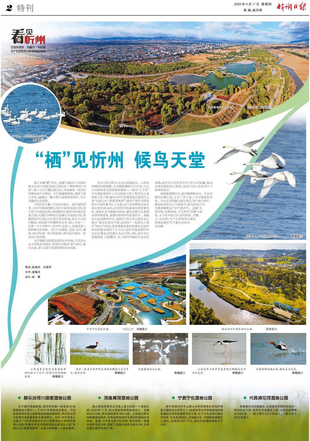 濕地蔥蘢棲百鳥(niǎo),星河璀璨映汾河。生態(tài)治理的如椽巨筆,正在三晉大地上書(shū)寫(xiě)著綠色傳奇。當(dāng)生態(tài)文明融入城市基因,每個(gè)春天我們都會(huì)收到來(lái)自山川的情書(shū),候鳥(niǎo)的每片羽毛都承載著這個(gè)時(shí)代的詩(shī)行。這幅“水清岸綠、魚(yú)翔淺底、萬(wàn)鳥(niǎo)和鳴”的醉人畫(huà)卷,正為忻州奮力打造有特色、有魅力、有品質(zhì),生產(chǎn)生活性?xún)r(jià)比最優(yōu)的精品城市寫(xiě)下最生動(dòng)的生態(tài)注腳。