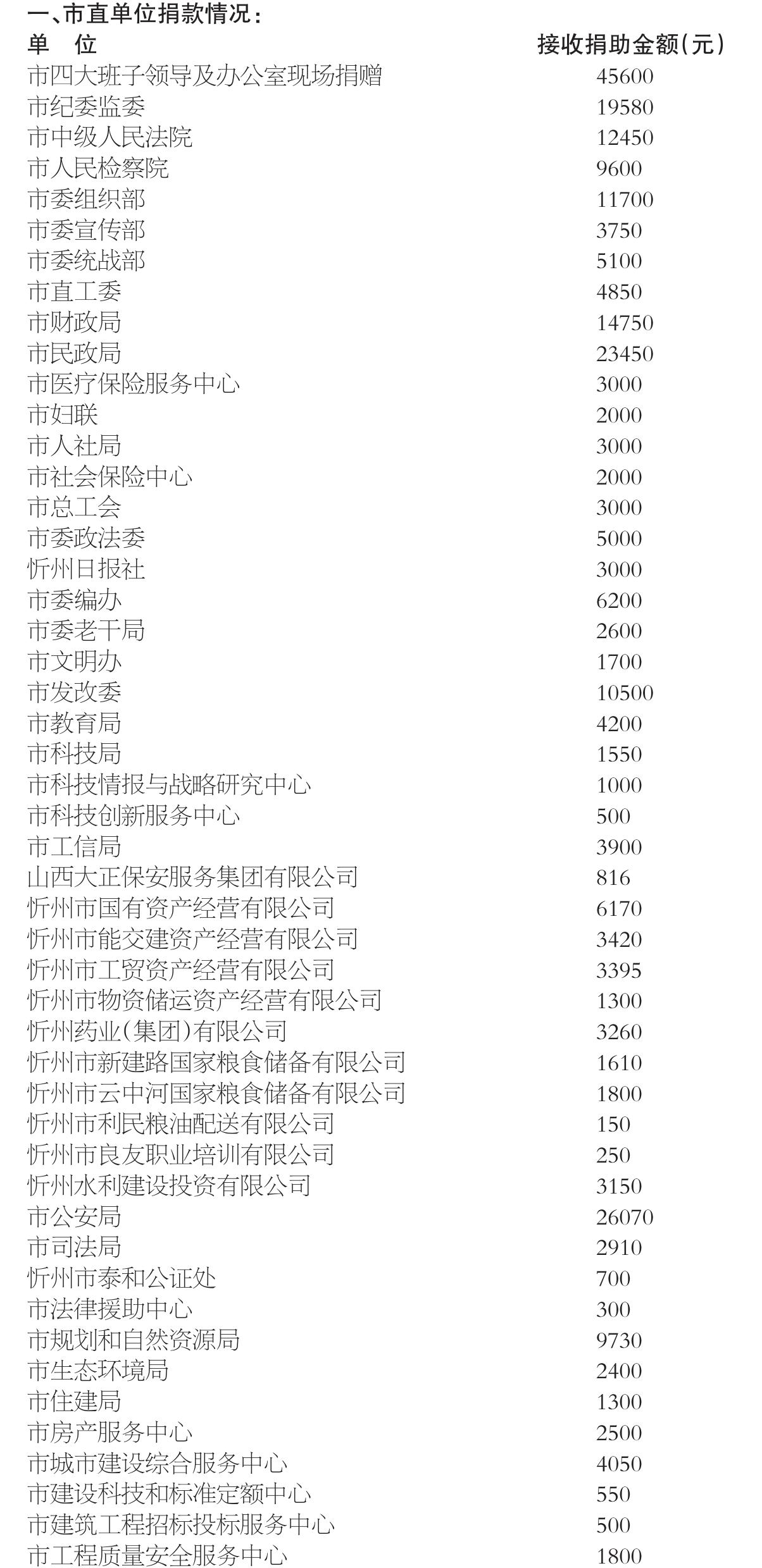 2024年11月22日,市委、市政府辦公室發(fā)出《關(guān)于開展“送溫暖、獻(xiàn)愛心”社會捐助活動的通知》,市四大班子領(lǐng)導(dǎo)和機(jī)關(guān)干部率先垂范,各縣(市、區(qū))、各單位高度重視,認(rèn)真組織,廣大干部職工積極響應(yīng),“送溫暖、獻(xiàn)愛心”社會捐助活動有效開展。截至2025年4月底,市直140個(gè)單位組織干部職工參與捐助,共捐款766388元,各縣(市、區(qū))接收捐款338.09萬元,合計(jì)捐款4147288元,為解決全市人民群眾的生產(chǎn)生活問題起到了積極作用?,F(xiàn)將捐助情況公告如下(市直單位以捐助時(shí)間先后為序):