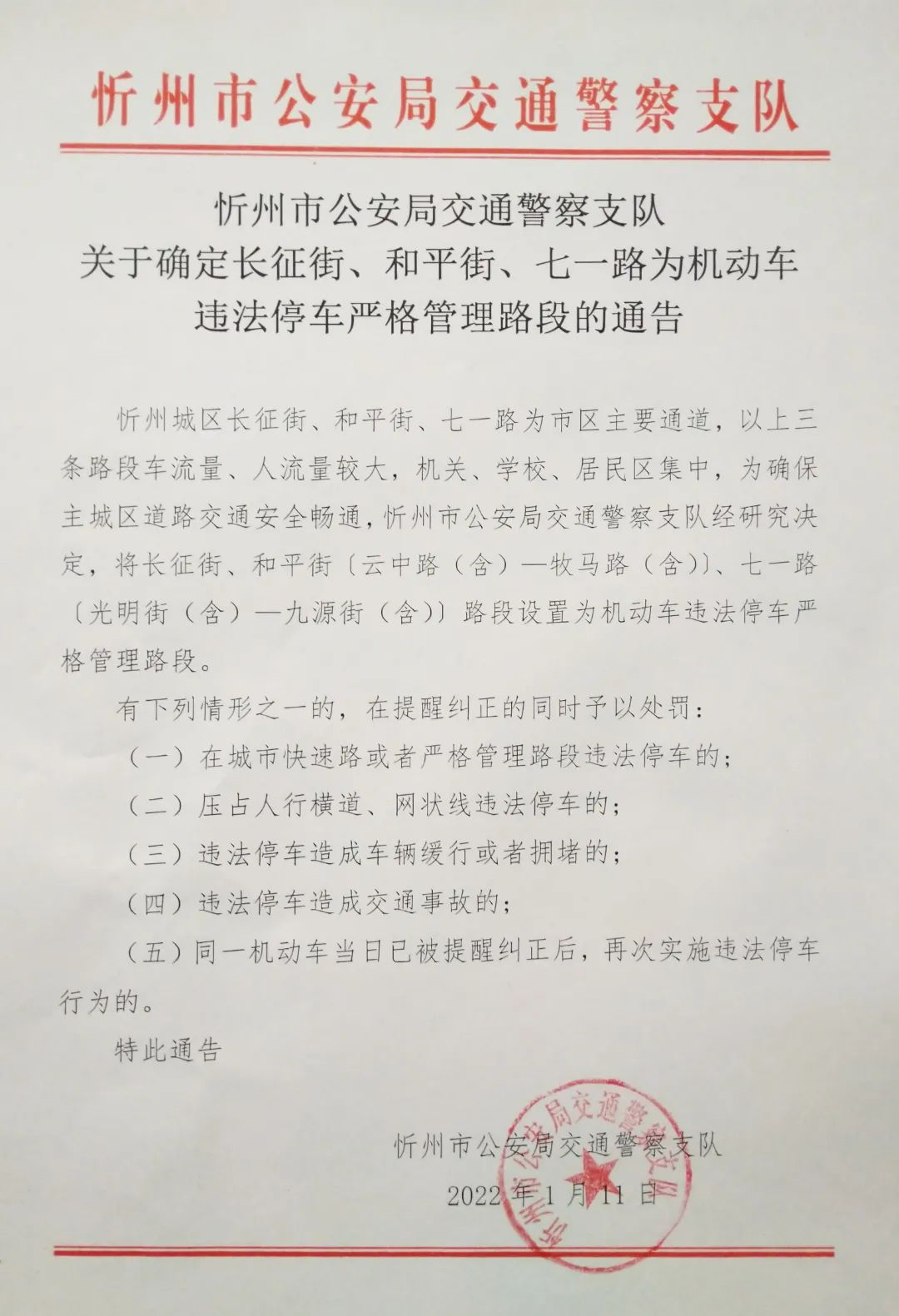 忻州市公安局交通警察支隊(duì)關(guān)于確定長征街、和平街、七一路為機(jī)動(dòng)車違法停車嚴(yán)格管理路段的通告