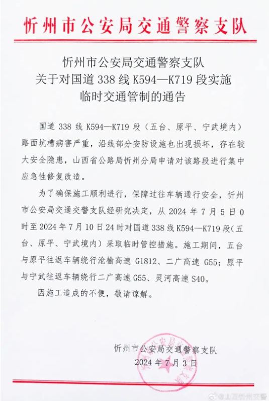 關(guān)于對(duì)國(guó)道338線K594—K719段實(shí)施臨時(shí)交通管制的通告