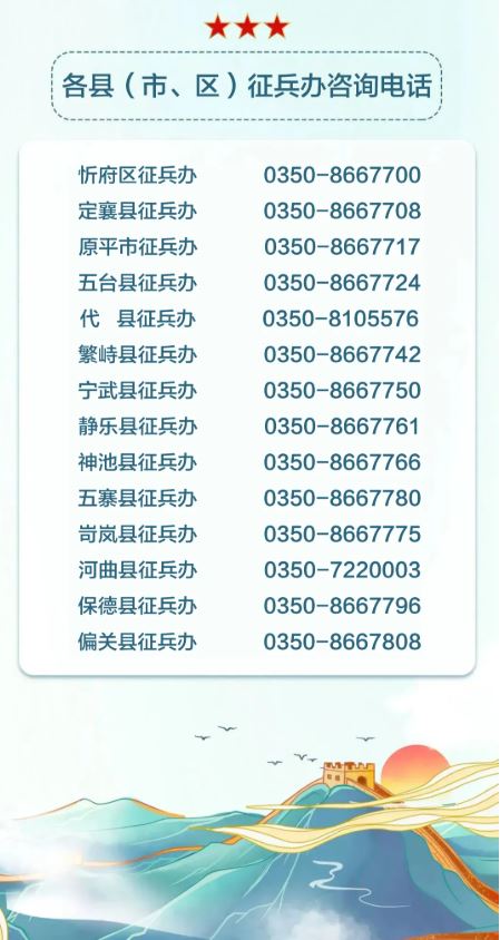 各縣(市、區(qū))征兵辦公室咨詢電話,請(qǐng)關(guān)注并進(jìn)入微信公眾號(hào)“山西征兵”點(diǎn)擊下方“聯(lián)系我們”中“各地征兵辦電話”查詢。