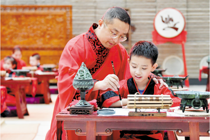 9月13日,一場(chǎng)漢服“開筆禮”在西安大唐西市博物館舉行,多名孩童著漢服,行漢禮,通過“朱砂開智”“啟蒙描紅”等環(huán)節(jié)體驗(yàn)中國傳統(tǒng)文化。圖為家長(zhǎng)帶領(lǐng)孩子一起進(jìn)行“啟蒙描紅”。 新華社記者 劉瀟 攝 (責(zé)任編輯:盧相?。?/span> |