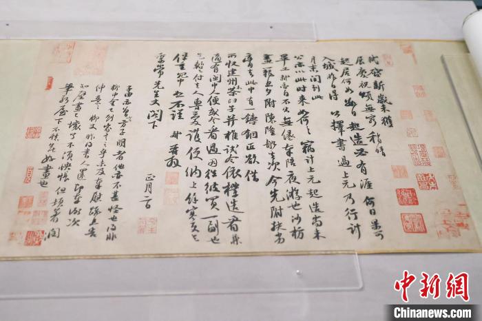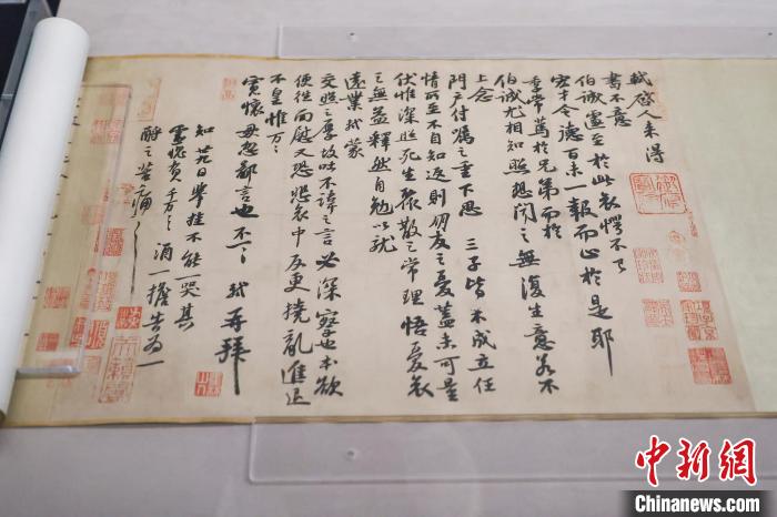 近日,“千古風流 不老東坡——蘇軾主題文物展”在海南省博物館舉行。圖為展出的蘇軾真跡《人來得書帖》。 中新社記者 駱云飛 攝