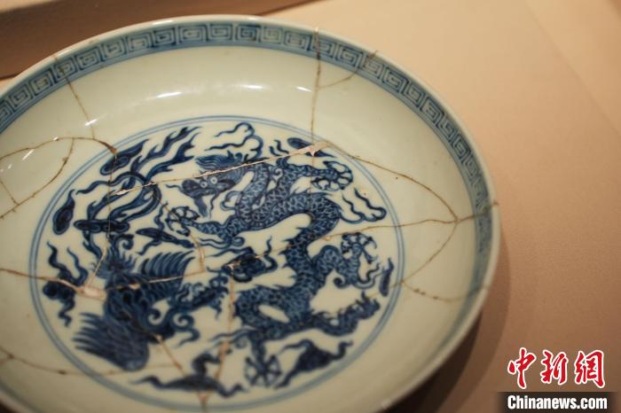 在展覽中,除精致的成品瓷外,一些因瑕疵無法面世的碎瓷片也講述著御瓷故事。“這件器物的器型和發(fā)色都非常好,但因?yàn)榘盐遄埉嫵闪肆Ρ悴荒艹手劣?,諸如此類任何細(xì)微的差錯都是不被接受的?!睋?jù)李雪蕾介紹,明清御窯對于龍紋有嚴(yán)格的規(guī)定,尤其是明代早中期,龍紋只許皇家使用,而五爪龍只供皇帝使用,出于御窯嚴(yán)苛的挑選制度和規(guī)范流程,明代早中期的淘汰品為避免流入民間都被打碎就地掩埋。