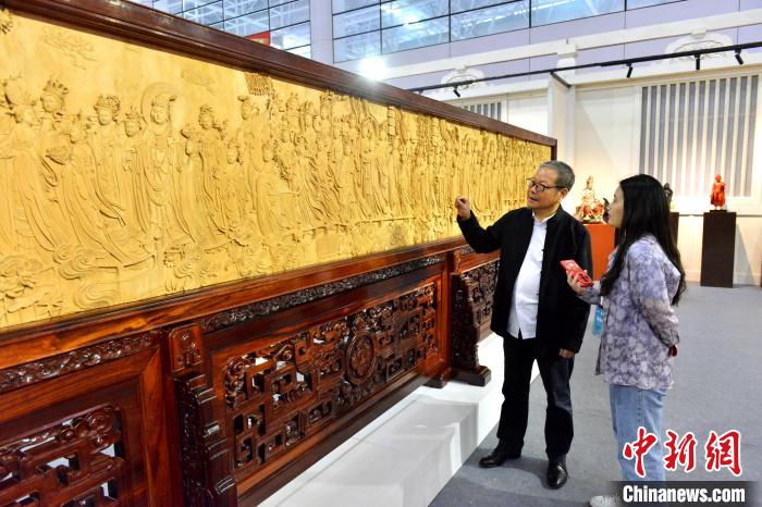 中新網(wǎng)福州5月10日電 (葉秋云)9日至12日,第四屆中國(guó)工藝美術(shù)博覽會(huì)于福建福州舉辦,由中國(guó)工藝美術(shù)學(xué)會(huì)造像藝術(shù)專委會(huì)主任、中國(guó)工藝美術(shù)大師袁師永與徒弟共同創(chuàng)作的雕漆作品《凈土文化對(duì)瓶》首次面向觀眾展出,吸引眾多觀展者的目光。
