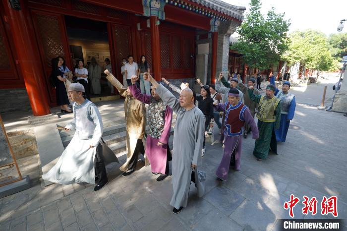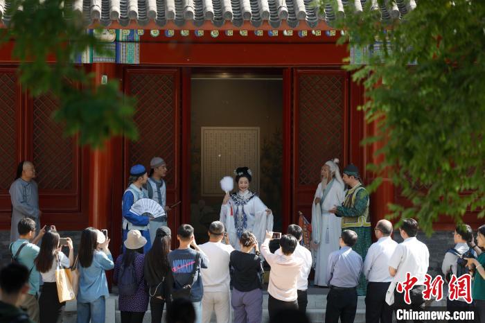 中新網(wǎng)北京5月17日電 題:從看客到主角 博物館搭臺邀觀眾置身“史”內(nèi) 中新網(wǎng)記者呂少威 “咚咚咚……”位于北京市西城區(qū)的北京宣南文化博物館內(nèi)傳來渾厚的鼓聲,循聲望去,一位身著古裝的俊美“青年”正用力擊鼓。全國首部沉浸式導(dǎo)覽劇《宣南往士》在此上演。 “擊鼓人”名叫謝佳男,本職工作是銀行職員,在該劇中客串演出,這是她第一次從“觀展”變身“參展”。 角色的演變緣于今年5月初,她與孩子一起觀看了該劇的表演?!霸跉v史古跡中的穿越式演出,完全超出了我的預(yù)期,代入感很強,觀看時已然覺得自己是這段歷史的主角,連同孩子一起饒有興趣地看完了全場,記住了很多歷史故事。”謝佳男告訴記者,隨后她便萌生了參演的想法并夢想成真。 這場演出的舉辦地——北京宣南文化博物館,位于距今有400多年歷史的“京師首剎”長椿寺內(nèi),三進院落隱于民居之間,在高大的百年國槐蔭庇下盡顯古韻。