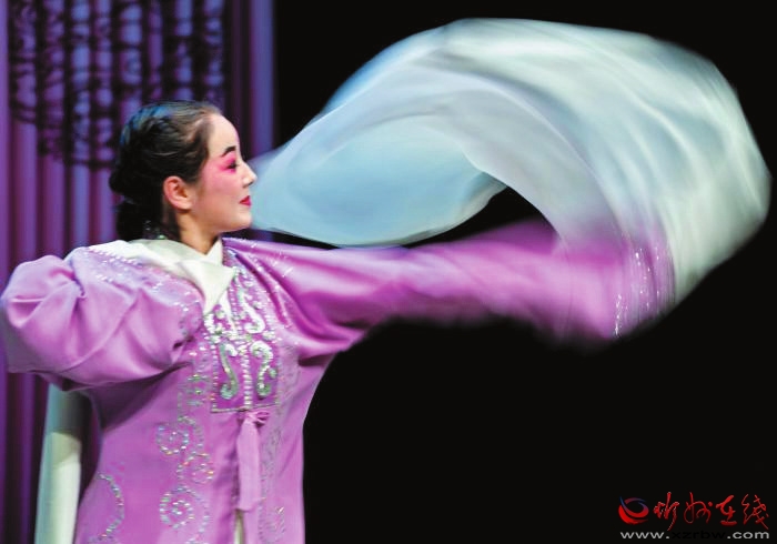演出中場休息時,演員太雨琴為觀眾示范北路梆子“水袖”技藝。