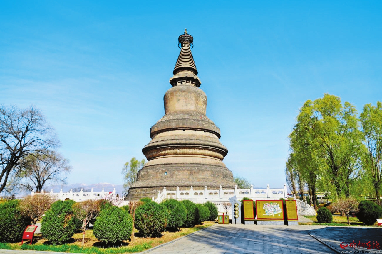 阿育王塔位于代縣上館鎮(zhèn)東北街村東大街北縣政府后院。據(jù)《代縣志》記載,原為圓果寺內(nèi)建筑,1937年日軍拆毀寺院,僅存磚塔。該塔始建于隋仁壽元年(601年),初為木結(jié)構(gòu),唐會(huì)昌五年(845年)“滅法”時(shí)被毀,唐大中元年(847年)、宋元豐三年(1080年)、崇寧元年(1102年)重建,元至元十二年(1275年)改建為磚塔。該塔為喇嘛式磚塔,通高40米,占地面積1876平方米。塔平面呈圓形,磚石砌臺(tái)基,底徑20米,高1.5米。臺(tái)基上設(shè)束腰基座,刻有仰覆蓮瓣及纏枝花紋。塔身為圓形覆缽,塔剎分為剎座、相輪、傘蓋和寶珠,剎座須彌式,座中心矗立1根鐵質(zhì)剎桿,砌相輪十三層,上置圓形露盤(pán),狀為傘蓋,極頂置寶珠,上下疊置。2001年公布為全國(guó)重點(diǎn)文物保護(hù)單位。