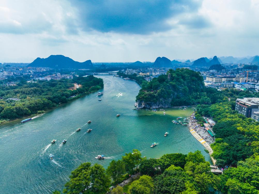 在桂林象鼻山景區(qū)一帶,游客乘船游覽漓江(無人機(jī)照片)。新華社發(fā)(劉崢 攝)
