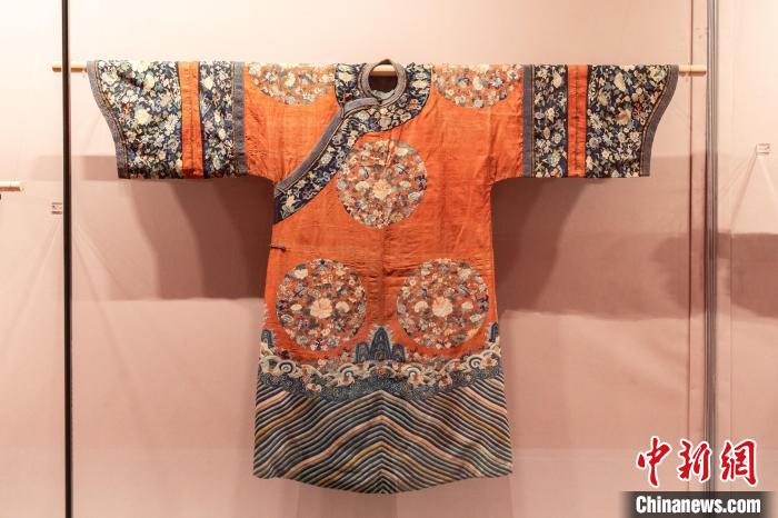 “這件吉服袍是清代滿漢服飾文化交融的重要見證:滿族作為北方游牧民族,為適應騎射之需,其傳統(tǒng)袍服多為‘緊身窄袖’樣式,清代中后期,受到漢族女裝寬身博袖造型影響,滿族宮廷女性吉服袍的袖筒及馬蹄袖口變得更加肥闊?!碧镙x說。