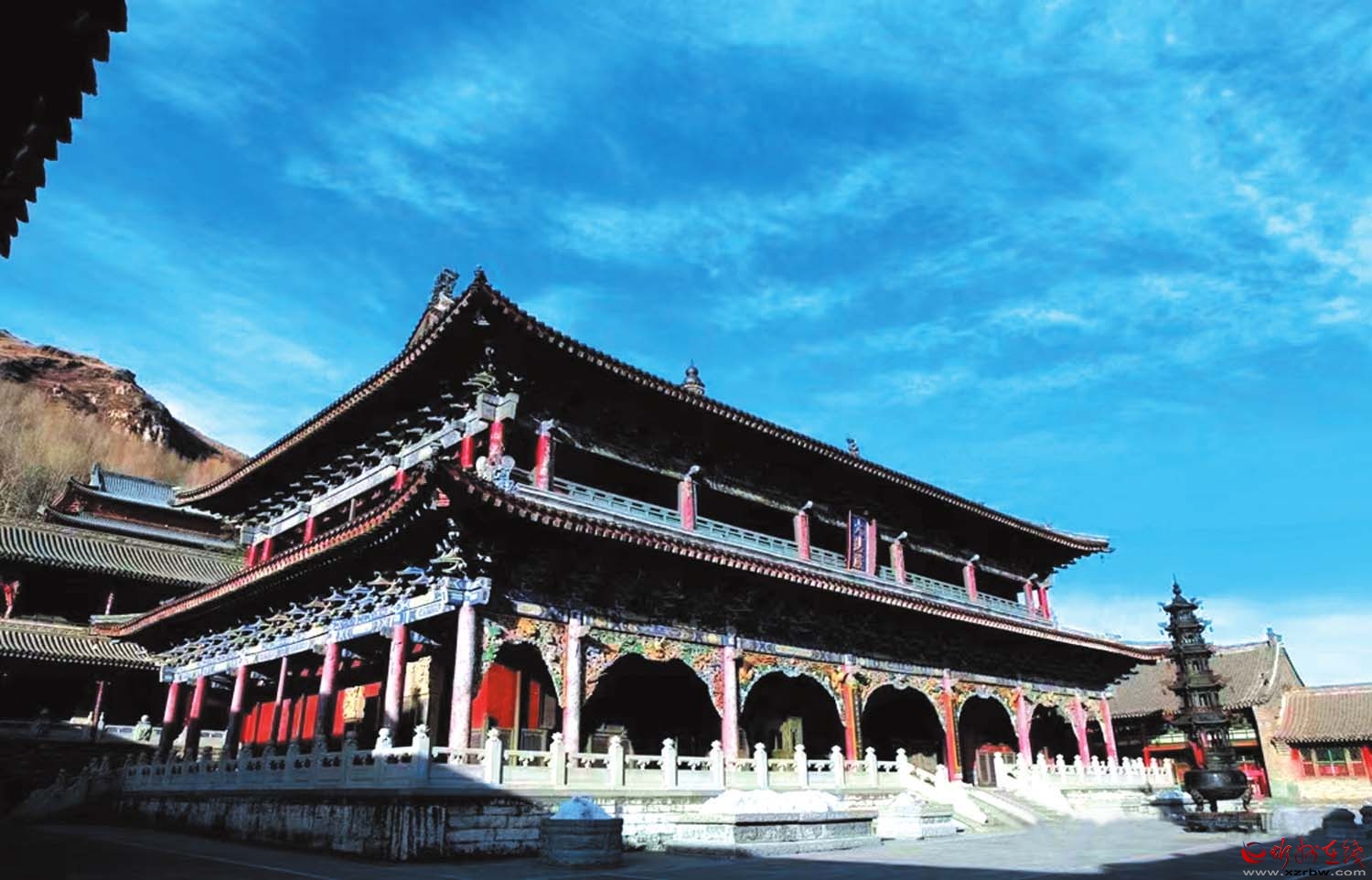 金閣寺各殿中塑像共有1000多尊,是五臺山佛教塑像最多的寺院。金身輝煌、慈悲莊嚴的佛像用智慧的眼神俯瞰大地,注視蒼生,穿透時空的薄霧,投放精神的光芒。金閣寺宛若一座奢華的藝術殿堂,包容著佛教文化的流變,工匠們巧奪天工的精湛技藝,與這里深厚的文化底蘊相得益彰。回廊上,榫卯間,是流轉千年的華麗建筑史詩。微風拂過,搖動檐角精致的風鈴,悠揚而純凈。遙望遠處山水風光,游目騁懷,思接千古,仿佛在與天地對話,感受自然的博大與生命的渺小。(高峰毅)