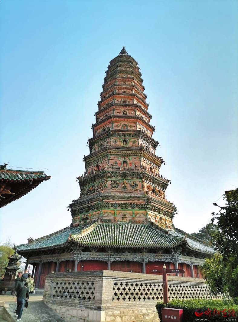 在洪洞縣,有一座舉世聞名的佛教古剎廣勝寺,“三絕一奇”令人驚嘆。一絕是飛虹琉璃塔,是廣勝寺標志性建筑,被推為全國第一塔,塔身外部有七色琉璃構件與裝飾圖形,每一層都有一組中心圖案,生動逼真,色彩艷麗,被認證為“世界最高的多彩琉璃塔”。二絕是《趙城金藏》,是玄奘從天竺取回的梵文經(jīng)卷中譯善本,世界上僅此一部,被譽為稀世珍寶。三絕是元代壁畫。內(nèi)容以祈雨、行雨、酬神等生活場景為主,布局嚴謹,造型生動,堪稱我國風俗神話題材的壁畫杰作。一奇是左右扭古柏,有1300余年歷史,一東一西,像兩位護法將軍守衛(wèi)著大殿。兩株古柏,左邊的朝左扭,右邊的向右扭,甚為奇特。