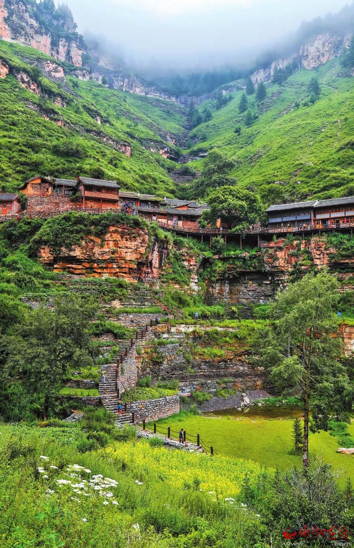 基巖構(gòu)造、河谷沖擊、垂直生態(tài)、冷涼氣候……有別于他處的雋永靈秀,寧武之境實(shí)乃神來之筆。懸空村位于寧武縣管涔山深處,現(xiàn)為蘆芽山風(fēng)景區(qū)的一個(gè)景點(diǎn),因村莊懸于峭壁之上而稱奇。村里多以石頭和木材建房,村中唯一道路是由圓木搭起的空中棧道,行于其上,猶如走在半空,從崖底仰望,似空中樓閣,故而得名。