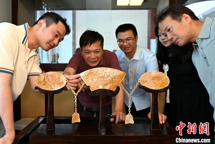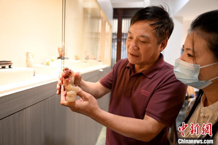5月8日,在中國(guó)工藝美術(shù)大師、壽山石雕大師陳益晶位于福建省福州市壽山石鑒定中心的工作室里,年逾七旬的陳益晶向游客介紹壽山石雕作品。中新網(wǎng)記者 呂明 攝 環(huán)顧四周,工作室的櫥窗里陳列著諸多壽山石雕作品,陳益晶輕輕摩挲著其中一件說(shuō)道,這些作品都如同他的孩子般珍貴。自小學(xué)三年級(jí)起,他便開(kāi)始學(xué)習(xí)壽山石雕,此后五十余載皆與壽山石相伴。陳益晶表示:“石不能言最可人?!?/p> 壽山石,乃福建省福州市晉安區(qū)特產(chǎn)。壽山石雕刻技藝由來(lái)已久,歷經(jīng)千年傳承,壽山石雕作品造型日益豐富。壽山石雕作品不僅是“石上書(shū)畫(huà)”,其藝術(shù)形式與審美范疇亦得到延展。 出生于福州市鼓山鎮(zhèn)上洋村的陳益晶,自幼便喜愛(ài)壽山石雕。小學(xué)三年級(jí)時(shí),他拜其舅父林炳生為師,學(xué)習(xí)壽山石雕。十六歲的他已出師,到福清市高山工藝美術(shù)廠擔(dān)任指導(dǎo),當(dāng)時(shí)他帶的徒弟普遍比他年長(zhǎng)兩歲。 1985年,陳益晶結(jié)婚后,又拜其岳父林發(fā)述為師,學(xué)習(xí)苞雕技法。經(jīng)過(guò)兩位師父的悉心指導(dǎo),加之自身長(zhǎng)期的實(shí)踐和鉆研,陳益晶的壽山石雕技藝日益精進(jìn)。因其擅長(zhǎng)用尖刀修光,下刀深且快,在業(yè)內(nèi)被稱(chēng)為“快刀手”。