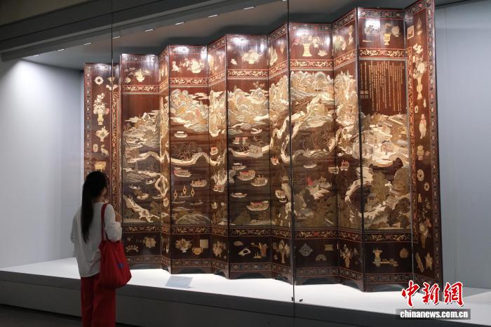 9月11日,游客在館內(nèi)的《刻灰西湖全景圖十二扇漆器屏風》前駐足。曹丹 攝