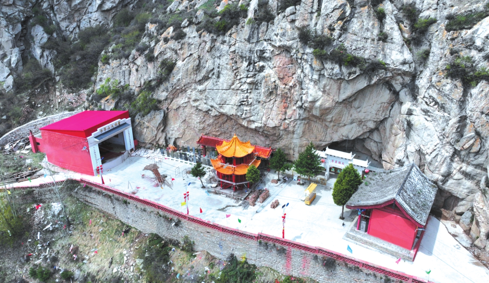 春日里,山桃花與山杏花沿坡綻放,粉白相間的花海從山腳漫至山腰,與翠綠的松柏相映成趣。此時(shí)若恰逢細(xì)雨,云霧在花間游走,“巾巖瀨雨”的奇景尤為靈動(dòng),水滴擊石的清音與花開的簌簌聲交織,仿佛天地間的私語。盛夏時(shí)節(jié),山中松濤陣陣,涼意襲人。雙巾峰下的“沁心泉”水量充沛,泉水清冽甘醇,飲之可去暑熱。沿山路行至“回音壁”,一聲呼喊能引來七聲回應(yīng),故又稱“七響巖”。傍晚時(shí)分,夕陽為石灰?guī)r峰巒鍍上金邊,池面波光粼粼,形成“巾峰夕照”的景致,與“瀨雨”并稱山中雙絕。秋日登高,則見株株松樹挺拔直立,廟宇與油松交相輝映,層林盡染。此時(shí)“瀨雨”之景尤為別致,洞內(nèi)泉水如鐘表滴答,當(dāng)?shù)厝朔Q為“秋漏”。有現(xiàn)代詩人描繪此景:“巾巖雄峙,霧繞云纏多靈氣;瀨雨淋漓,珠垂墜玉一奇觀?!毙蜗蟮匕炎匀恢襞c時(shí)間之感巧妙融合。冬雪初霽時(shí),巾字山銀裝素裹,雙巾峰如白玉雕琢的冠冕,“瀨雨”洞洞外凝結(jié)的冰棱如水晶簾幕,陽光折射下七彩斑斕,構(gòu)成冬日里的清麗樂章。