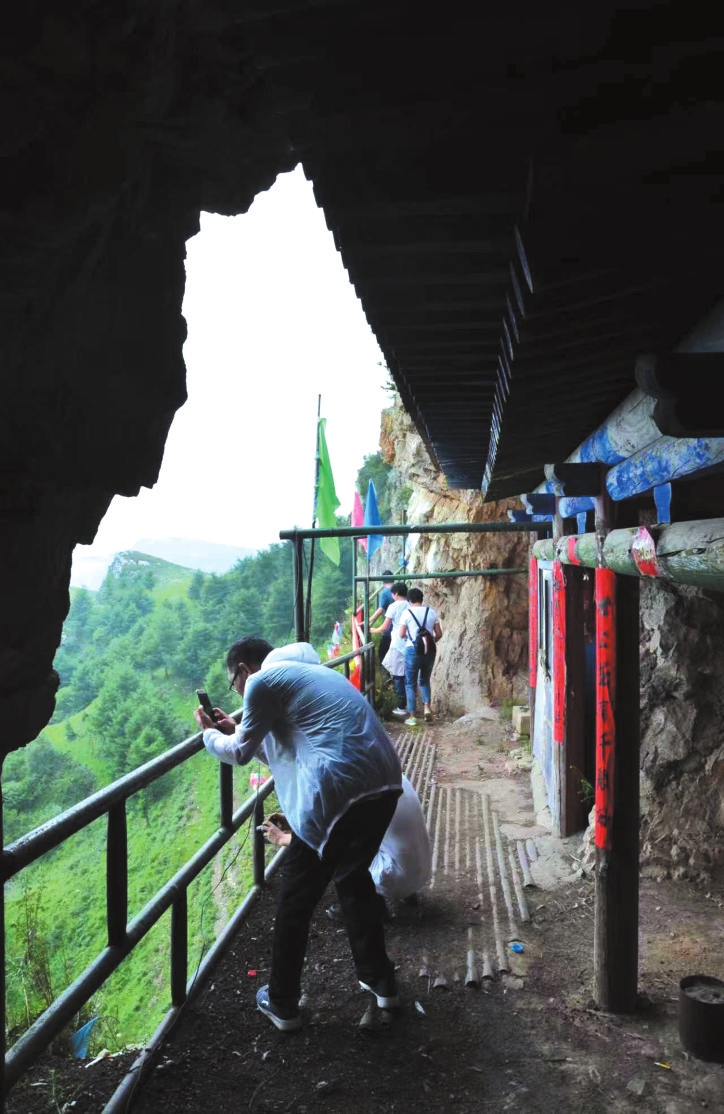從老君洞主峰下的羊腸小道向前走,可望見峰巒半腰間露出建筑物一角,那便是老君廟了。登臨老君廟,依靠在山的裂縫里開鑿出的一條棧道,一腳一蹬,一步一攀,急不得,快不了,就這樣亦步亦趨才能抵達(dá)這座懸在半空的小廟。