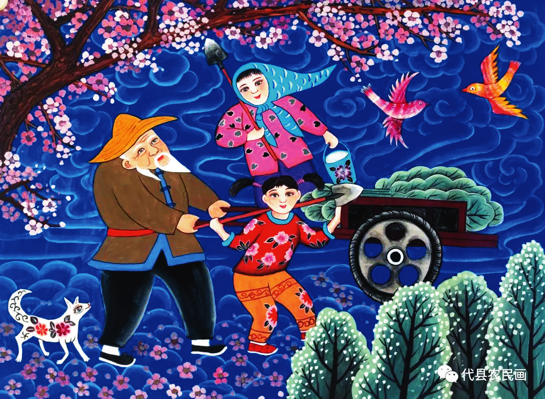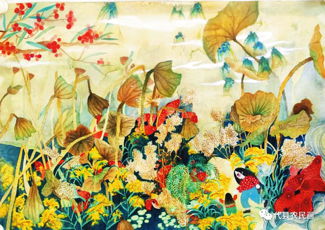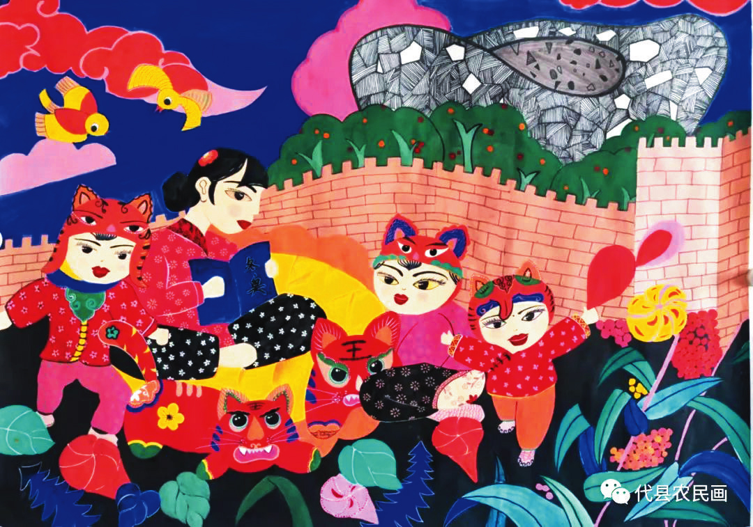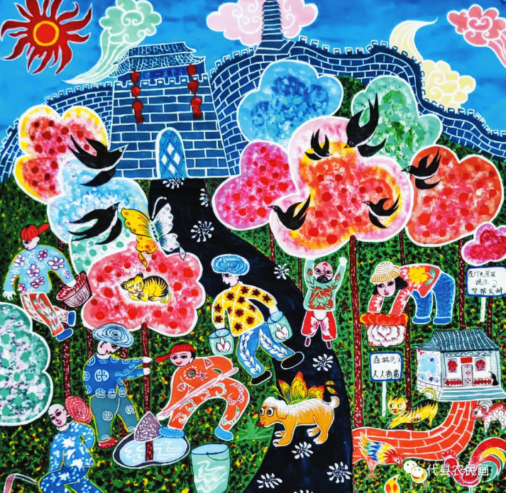 中國歷史文化名城代縣,文化底蘊深厚,民俗傳統(tǒng)技藝精巧別致,1988年和2008年先后被文化部授予“中國民間繪畫畫鄉(xiāng)”“中國民間文化藝術(shù)之鄉(xiāng)”。該縣的農(nóng)民畫早在上世紀(jì)80年代初就在全國產(chǎn)生過較大影響,之后經(jīng)歷了一段低迷期。近年來在代縣農(nóng)民畫促進會的推動之下,農(nóng)民畫又重新煥發(fā)出耀眼的光彩。先后涌現(xiàn)出多位畫家,其中尤以丁全愛、戴翠平、祁磊、賈永花、郎冬梅等18位女畫家組陣的雁門巾幗,在多年鉆研繪畫技巧的基礎(chǔ)上,創(chuàng)作出一幅幅特色鮮明、獨具匠心的畫作,成為閃耀三晉大地的矩陣,為傳承、弘揚雁門文化做出了新貢獻。