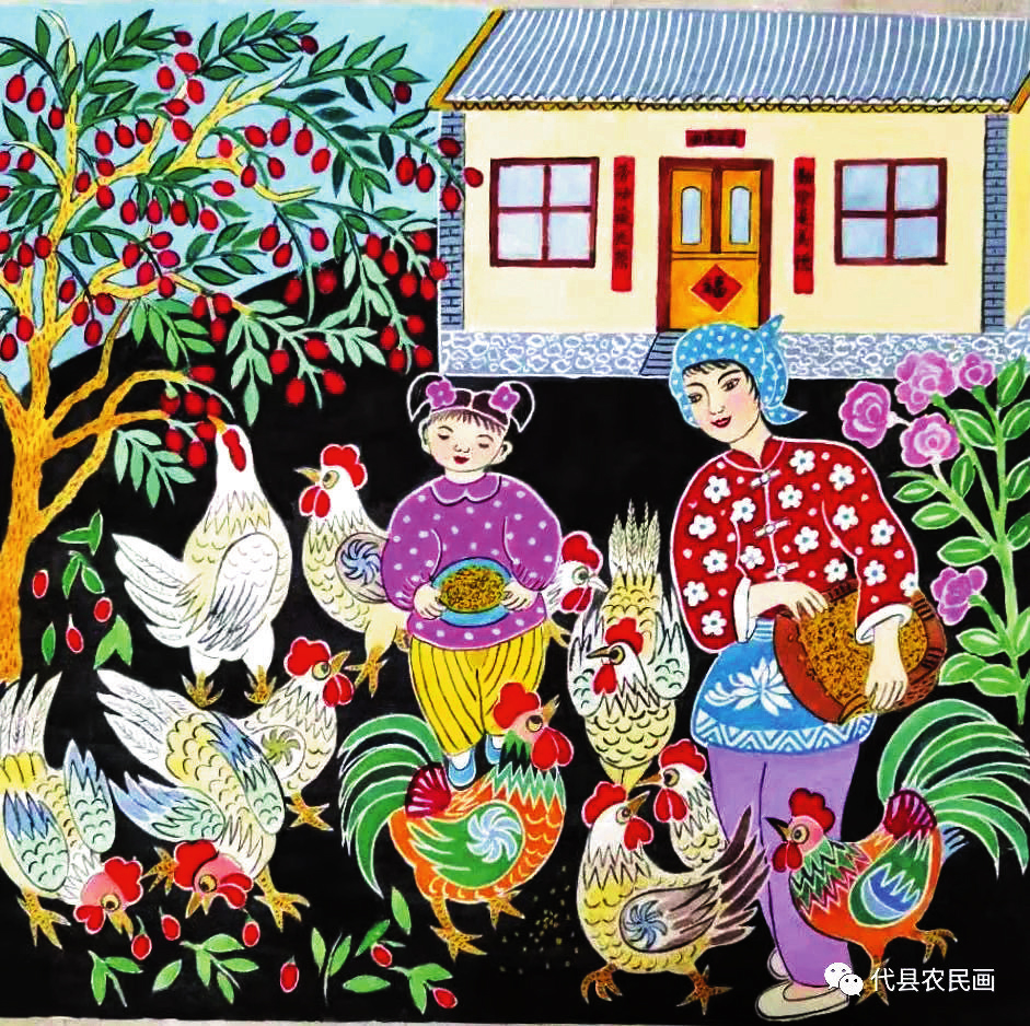 在代縣農(nóng)民畫促進會黨支部和主席團的引領(lǐng)下,這些女畫家積極參與促進會組織的各種交流和研討活動,不斷汲取藝術(shù)養(yǎng)分,深入探索研究農(nóng)民畫的創(chuàng)作技巧,使自己的繪畫技藝逐漸得到提升。她們特別注重借鑒代縣刺繡、面塑、剪紙等民間技藝的創(chuàng)作方法,從各種技藝當(dāng)中吸納有利于農(nóng)民畫創(chuàng)作的元素和營養(yǎng)。