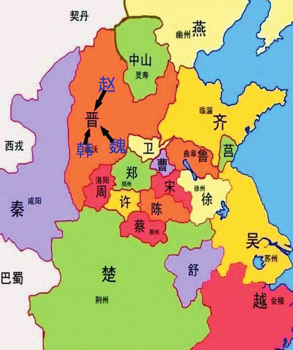晉文公執(zhí)政繼承其父三軍六卿制,韓、趙、魏、范、智、中行六卿各有自己的領(lǐng)地,勢力日漸擴張,他們一方面維護晉國霸業(yè),另一方面蠶食晉國君權(quán)和國土。到晉定公時期,晉國權(quán)勢趨向衰弱,六卿之間也相互蠶食領(lǐng)地。晉出公時期,智氏組織韓、趙、魏討伐范氏和中行氏,迫使二氏出逃,后韓、趙、魏、智四家瓜分了范氏和中行氏所有封地。四氏中,智氏領(lǐng)土最多,勢力最強,故向韓、趙、魏索要所得封地,韓、魏懼而滿足智氏要求,趙斷然拒之,被迫出逃,智氏組織韓、魏擊之未成。事后,韓、魏共識前車之鑒,唇亡齒寒,于是韓、趙、魏三卿聯(lián)合擊智,盡滅智氏全族。