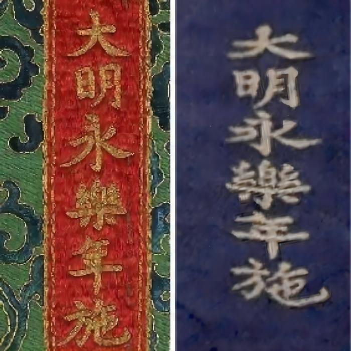 ▲“大明永樂(lè)年施”題款對(duì)比圖,左側(cè)綠底為永樂(lè)御制紅閻摩敵刺繡唐卡,右側(cè)藍(lán)底為明永樂(lè)勝樂(lè)金剛織錦唐卡。