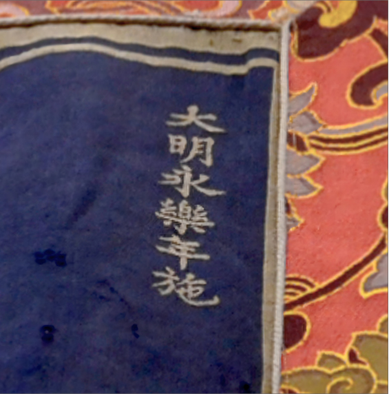 ▲明永樂(lè)織錦勝樂(lè)金剛唐卡右上角六字金色漢文楷書“大明永樂(lè)年施”題款。
