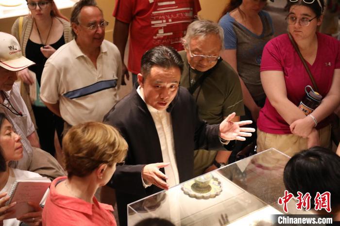 2019年6月,柏群在美國(guó)華盛頓的一家博物館向觀(guān)眾介紹金漆鑲嵌技藝。 (受訪(fǎng)者供圖)