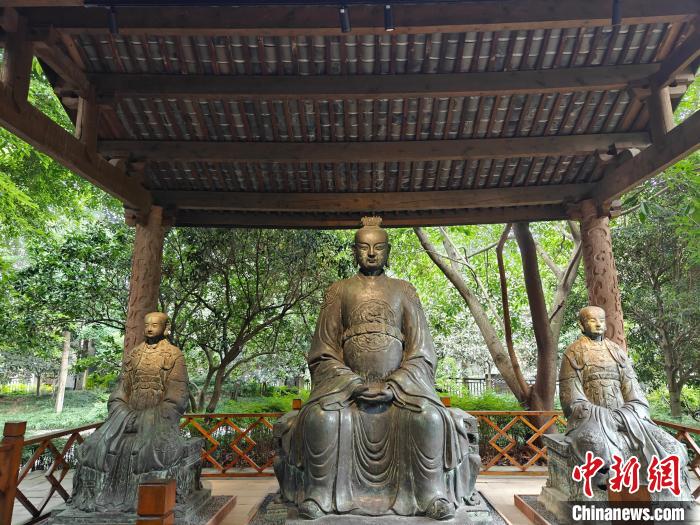 6月7日,“長江之神”戶外常設(shè)展在四川博物院開幕。圖中居中的青銅像為江瀆神主像,其高288.6厘米,左右兩側(cè)配像分別高236.5厘米、231厘米。(四川博物院供圖)