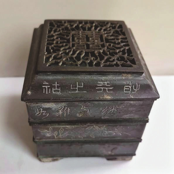 約二十年前,筆者在文物商店見(jiàn)到一只篆香方爐,形制規(guī)整小巧,鑄造典雅大氣,寓意吉祥,且價(jià)格不貴,便將其收入囊中。
