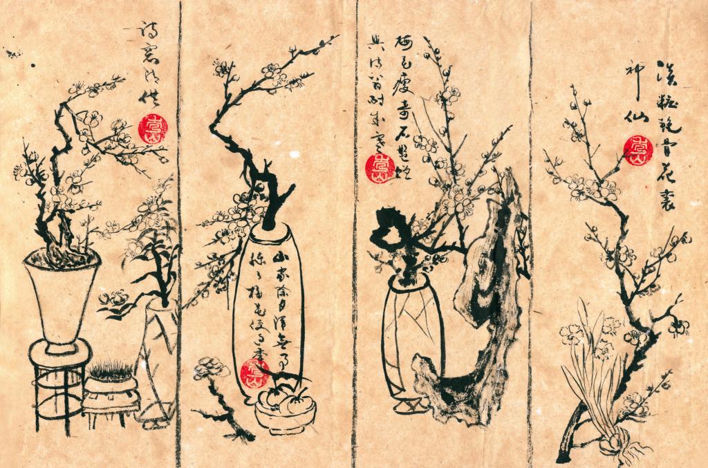 明代文震亨在其《長(zhǎng)物志》中有一段評(píng)述梅的文字:“幽人花伴,梅實(shí)專(zhuān)房。取苔護(hù)蘚封,枝稍古者,移植石巖或庭際,最古。另種數(shù)畝,花時(shí)坐臥其中,令神骨俱清,綠蕚更勝,紅梅差俗;更有虬枝屈曲,置盆盎中者,極竒。蠟梅磬口為上,荷花次之,九英最下,寒月庭際,亦不可無(wú)?!?/p>