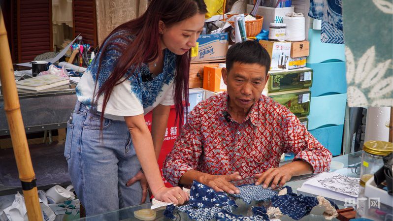 熊天艷和父親熊文杰在討論扎染紋樣(央廣網(wǎng)記者 魏文青 攝)