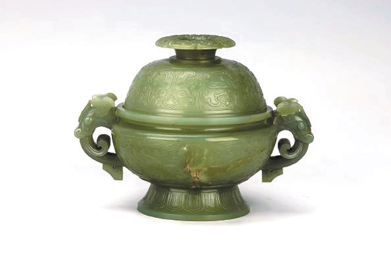 這件清代的獸面紋玉奩,高12.5厘米,口徑11.1厘米,底徑8.2厘米。青玉質(zhì)地,器物以整塊青玉為材料制作,圓形,由上下兩部分組成,高圈足。上面為奩蓋,下面為奩身。奩蓋看上去就像一只倒扣的大碗,釉面光潔,圓潤自然;蓋頂為空心,雕刻仰蓮瓣紋,蓋面雕刻獸面紋,紋飾細膩生動。奩身與奩蓋相扣合,頸部兩側(cè)相對稱地各鏤雕獸首耳一只,分別與奩腹下相接。腹部滿浮雕獸面紋。圈足外一圈凸雕仰蓮紋,隨器形伸展,充滿動感,讓人心生聯(lián)想:若是將之置于水中,一定頗有幾分清人汪懋麟筆下“玉奩亂潑脂水濃,春波半濺青裙?jié)瘛钡囊馊ぶ?。(李笙清?/p>