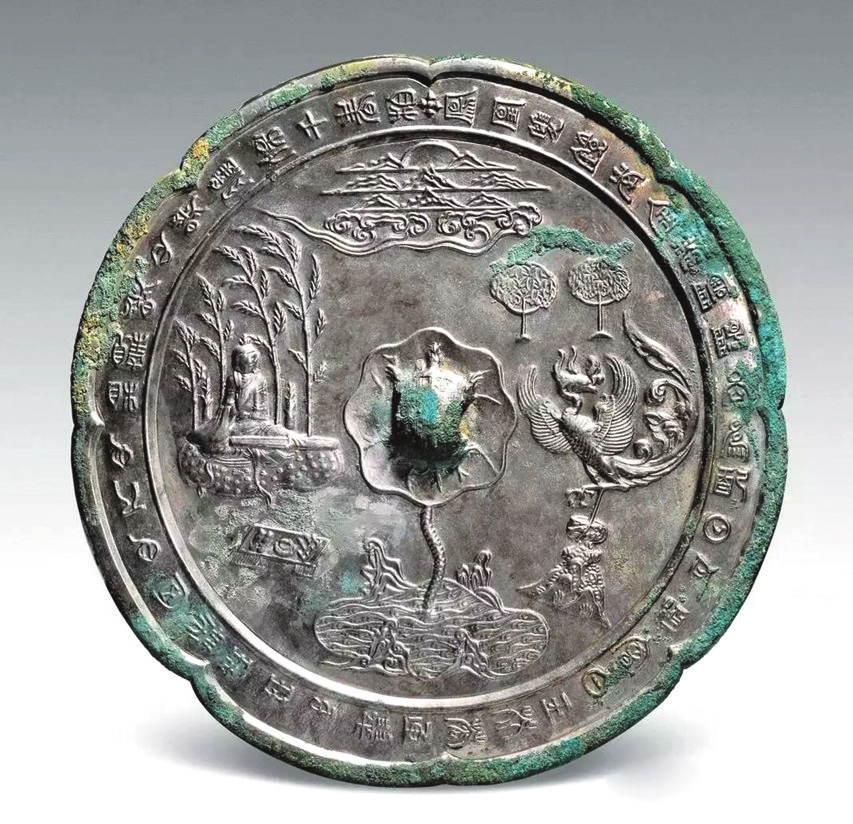 真子飛霜鏡一般都是圓形、葵花形,而西安出土的一面鏡形十分罕見,為亞字形。鏡背上方云海托月,半個(gè)月亮浮上來。真子飛霜鏡的形制,多在細(xì)節(jié)上略有差異。除了鏡鈕上方有“真子飛霜”四字,或者有一只飛翔的仙鶴之外,還有一種在鏡緣飾篆書體銘文,鏡銘為:“鳳凰雙鏡南金裝。陰陽各為配,日月恒相會。白玉芙蓉匣,翠羽瓊瑤帶。同心人,心相親,照心照膽保千春。”