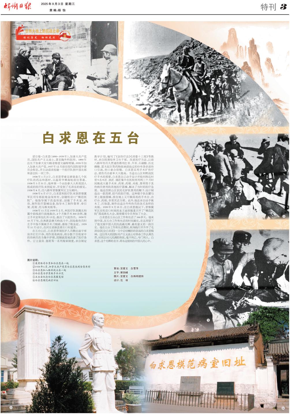 白求恩在五臺(tái)山區(qū)工作和生活了100多天。他來到中國,在五臺(tái)工作和生活的時(shí)間最長,在這里留下了他支援中國人民抗戰(zhàn)最光輝、最有意義的一段歷史。他在五臺(tái)工作和生活期間,躬身踐行并升華了毛澤東《紀(jì)念白求恩》一文中總結(jié)概括的崇高的白求恩精神。這位偉大的國際共產(chǎn)主義戰(zhàn)士對(duì)革命工作認(rèn)真負(fù)責(zé),對(duì)同志對(duì)人民滿腔熱忱,毫不利己,專門利人。白求恩,這個(gè)光輝的名字,將永遠(yuǎn)銘刻在中國人民心中。