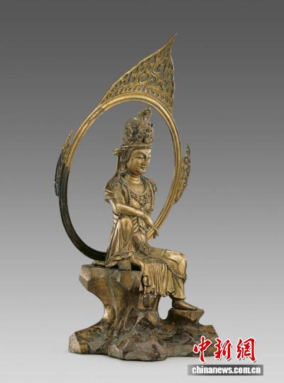 中新網(wǎng)金華9月17日電(董易鑫 孫媛媛)高53厘米,整尊觀音頭戴高冠,冠上飾化佛,身佩瓔珞,左臂撐巖,右臂置膝,左腿下垂,右腿上曲足踏巖石,安坐于山巖之上,身旁石上置一凈瓶,身后一圓輪狀大背光,渾圓精美,邊緣裝飾火焰紋,仿佛巖前有潺潺流水,觀音目觀水中月影——這是68年前出土于浙江金華萬佛塔地宮的五代鎏金銅觀音造像,也叫作“水月觀音”,是國家一級(jí)文物,現(xiàn)藏于中國國家博物館。 9月26日,金華市博物館將舉辦重磅展覽“萬相重光——浙江佛教藝術(shù)千年大觀”,主角之一就是回家“省親”一個(gè)月的“水月觀音”。這是時(shí)隔15年后,“水月觀音”原件再次回鄉(xiāng)展出。