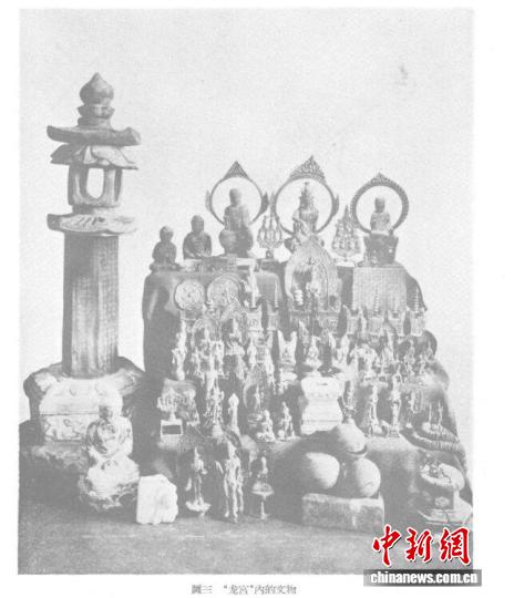 “水月觀音”。(資料圖)(金華發(fā)布供圖) 1956年底,某駐金部隊(duì)在萬佛塔遺址上選址建造部隊(duì)醫(yī)院,清理塔基時(shí)發(fā)現(xiàn)了塔基下的地宮。據(jù)悉,塔基呈六角形,中心有方形石板,從石板的破洞往里看,可以看到內(nèi)有文物。為此,金華有關(guān)部門立即電報(bào)通知浙江省文物管理委員會(huì)。 1957年1月1日下午,萬佛塔地宮發(fā)掘工作正式開始,由浙江省文物管理委員會(huì)專家王士倫(曾任浙江省文物考古研究所所長)主持,直至次日凌晨結(jié)束。 經(jīng)文物專家細(xì)致發(fā)掘,萬佛塔地宮內(nèi)共出土了經(jīng)幢、坐像、立像、千佛、銅龍、銅馬、金塔、銅鏡、禪磚、銅盒、石刻、石座等35種類別的183件珍貴文物。