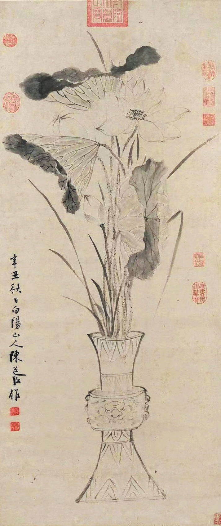 陳淳的《瓶荷寫(xiě)生圖》中,一青銅花觚內(nèi)插數(shù)枝荷花,細(xì)葉菖蒲點(diǎn)綴其間。向上伸展的枝葉幾乎占滿畫(huà)面,盡顯夏日花草的勁挺之氣與蓬勃生機(jī)。此作給人最大的視覺(jué)感受是不拘一格的瀟灑筆觸與靈動(dòng)造型,尤其靠下方的兩片荷葉,以及右側(cè)彎折垂下的一片細(xì)葉,甚至顯現(xiàn)出一絲不加修飾的潦草、頹敗之感,而恰是對(duì)此等細(xì)節(jié)的保留,生動(dòng)體現(xiàn)出植物自然的生長(zhǎng)姿態(tài)。