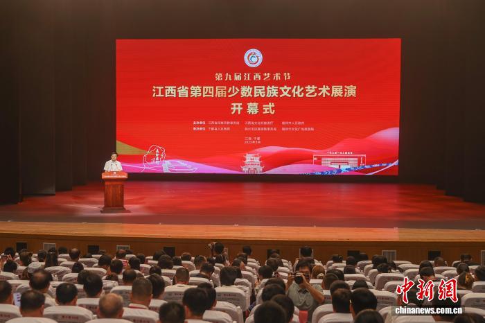 9月23日晚,江西省第四屆少數(shù)民族文化藝術(shù)展演在贛州于都縣開幕。劉力鑫 攝 本屆展演以鑄牢中華民族共同體意識為主線,緊扣“文化傳承 紅色引領(lǐng) 主線聚力”主題,江西各設(shè)區(qū)市組團(tuán)選送作品和節(jié)目參加。展演為期3天,活動內(nèi)容豐富、形式多樣,既有高水平的藝術(shù)展演,也有接地氣的成果展示。包括開幕式、原創(chuàng)劇目首演、民族題材書畫攝影作品展、鑄牢中華民族共同體意識圖片展、民族歌舞展演、民族鄉(xiāng)村和美村寨建設(shè)行動成果展示等內(nèi)容。